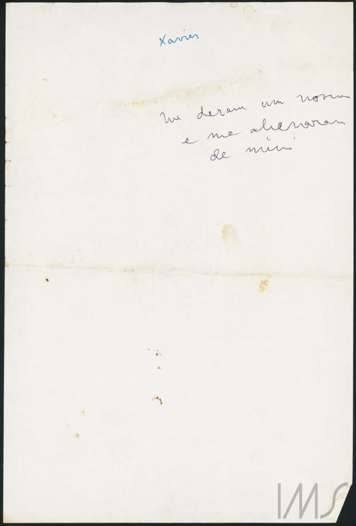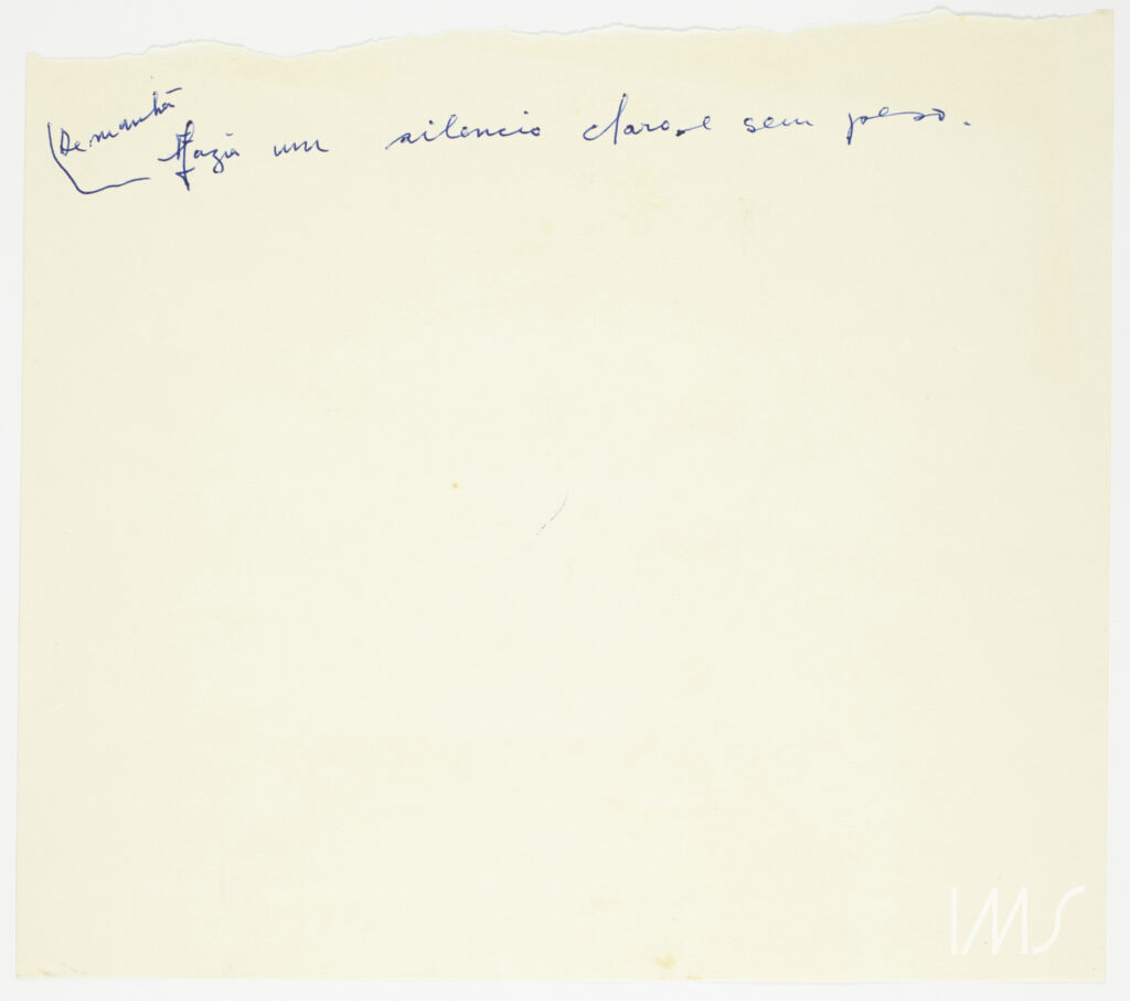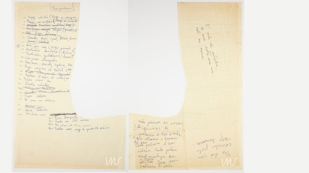 Vale recuperar o movimento duplo já tratado anteriormente que se faz patente no documento de código 001501_0169: o de rasgar o que escreveu e o de aproveitar um papel rasgado para escrever. Se a face intitulada “Perspectivas” tem um rasgo na vertical que levou parte de seu conteúdo, deixando frases incompletas, na outra face há três pequenos blocos de escrita que acontecem no entorno do rasgo, ao redor dele. O rasgo vira uma margem e impõe um limite invisível que é respeitado pelos blocos escritos.