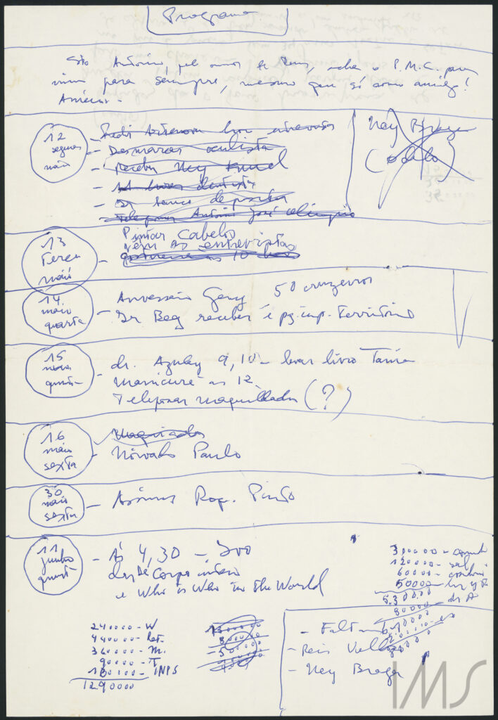 O fólio 001501_121_verso permite acompanhar as atividades programadas entre 12 de maio e 11 de junho de 1975.4 Mas em vez de iniciar com as tarefas, o primeiro quarto da página é um pedido a Santo Antônio, para que ele “ache o P.M.C.” – sigla que, provavelmente, faz referência a Paulo Mendes Campos, autor mineiro com quem Clarice teve uma breve relação amorosa.