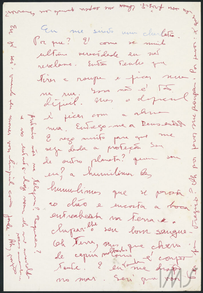 Algo semelhante acontece bem no meio da sílaba, mas agora é a caneta esferográfica vermelha que completa onde a azul falta: “Eu me sinto um charlatão”. Mas se acaba a tinta, o impulso de escrever não acaba, não arrefece, nem mesmo tendo de levantar da mesa para buscar outra caneta, quem sabe pedir a alguém que lhe traga uma caneta que funcione ou se estique para alcançar um porta-treco em cima da mesa. Pelo contrário, o impulso de escrever se intensifica e nem mesmo o fim da página significa o fim do pensamento. Insistentes, as palavras inventam outras margens, subindo pelas beiradas e aproveitando toda a superfície da página.
