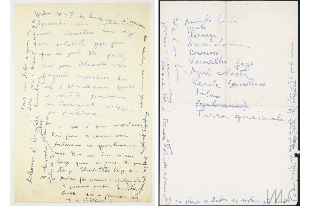 Outro ponto possível de leitura dos fólios de Um sopro de vida é a dos instrumentos de escrita. A convivência entre as cores de distintas canetas traz uma informação temporal: é uma marca de retorno. Estes documentos foram, no mínimo, relidos com a caneta em punho e olhos atentos. Independentemente da cor, importava marcar a diferença e explicitar a releitura. Se o texto que corresponde ao tempo 1 pode ter sido escrito num jato, como a expressão da escritora “diante da coisa que lhe vem”, o remendo corresponde ao tempo 2, cuja mesma escritora despe-se do ato criador, afina seu olhar e lê com a caneta nas mãos, não só com os olhos.