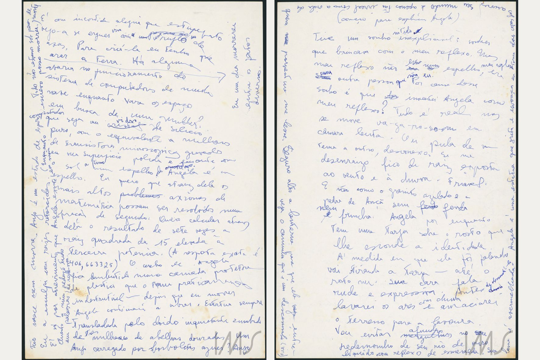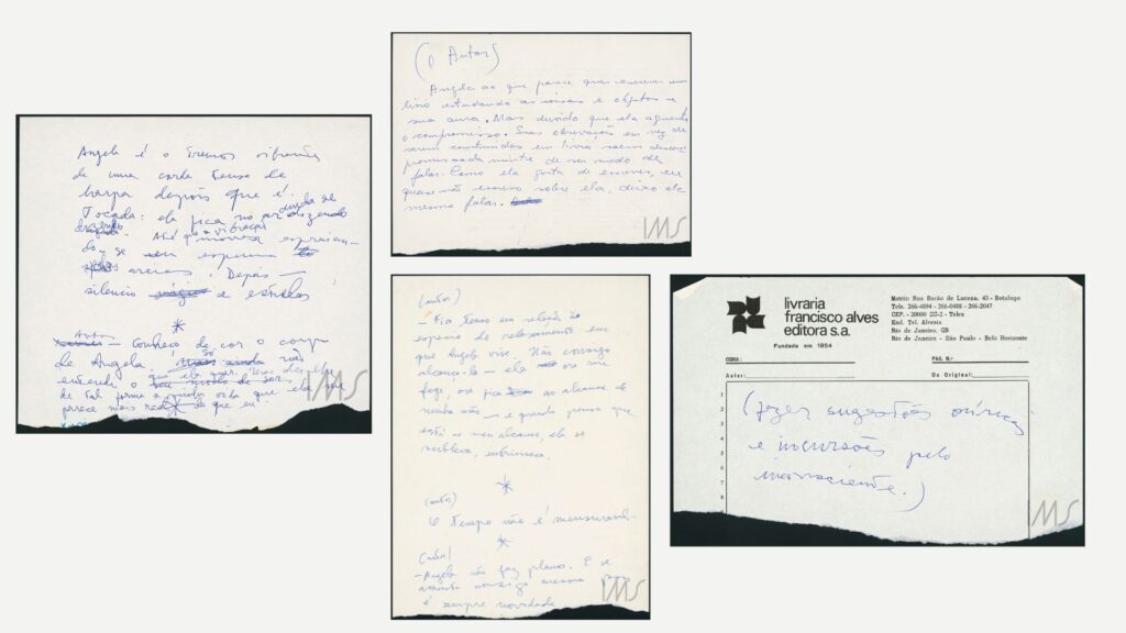 As cores das canetas – azul e preta – também computam, no mínimo, dois tempos. Em preto, por essa altura, Angela Pralini ganha seus primeiros traços biográficos: “rapidamente porque dados e fatos me chateiam. Vejamos, pois: nasceu no Rio de Janeiro, tem 34 anos, 1 metro e setenta de altura e é bem nascida, embora filha de pais pobres. Uniu-se a um estudante etc”.