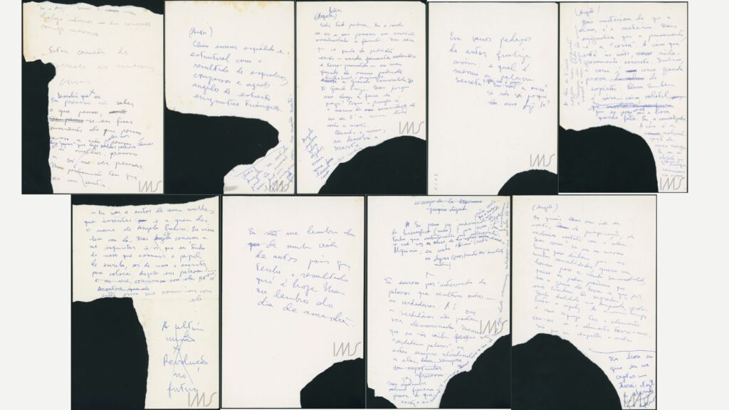 É precisamente pela importância reduzida dada ao que está a lápis que, nos manuscritos, há uma informação recorrente: trata-se de um código, geralmente, no canto da página, que identifica se determinado trecho foi publicado em Um sopro de vida ou em Esboço para um possível retrato. Sem dúvida, o código não foi escrito por Clarice Lispector e é posterior a 1978, mas anterior à doação feita ao Instituto Moreira Salles em 2018. O lápis aí não é apenas um instrumento de escrita, mas uma forma de fazer a informação ficar quase transparente, invisível: essa informação não quer disputar espaço. O palco da página ainda é garantido para o texto de Lispector; é para ele que o olho deve se voltar.