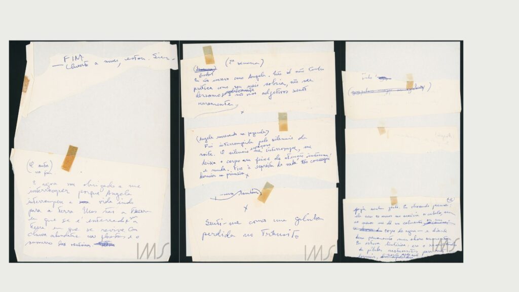 Embora seja ocorrência única, o fólio 001501_006, a seguir, registra não só o tempo distribuído entre escrita, leitura e revisão, como, na linha da duração, congela um ato de segundos. No último dos 3 fragmentos remendados, a materialidade encontra, de forma perfeita, o conteúdo – a coisa dura encontra, de forma perfeita, a imaginação: é que a tinta da caneta azul falha no momento em que Lispector escreve “Termina o livro”. Sem prejuízo do sentido, o verbo terminar pode ser trocado por acabar. Acaba a tinta, termina o livro; termina a tinta, acaba o livro. Quem lhe socorre, daí pra frente, é a tinta preta que, no amanhecer depois do fim, faz os galos cantarem.
