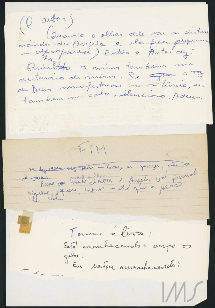 Briefly presented here, these manuscripts open up the possibility of articulating the items with other units of the collection, being, at the same time, everything that there is on A Breath of Life and the parts that participate in this whole. In a way, what instigates me is being able to trace lines of analysis that aid in reading beyond narrative stabilization, understanding that unediting is only one among many possible interpretive agendas, but one that seeks to stir the gentle tedium of order, both in the institutionalized archive and in the published book version, by placing the texts in relation, whether of conflict or agreement.