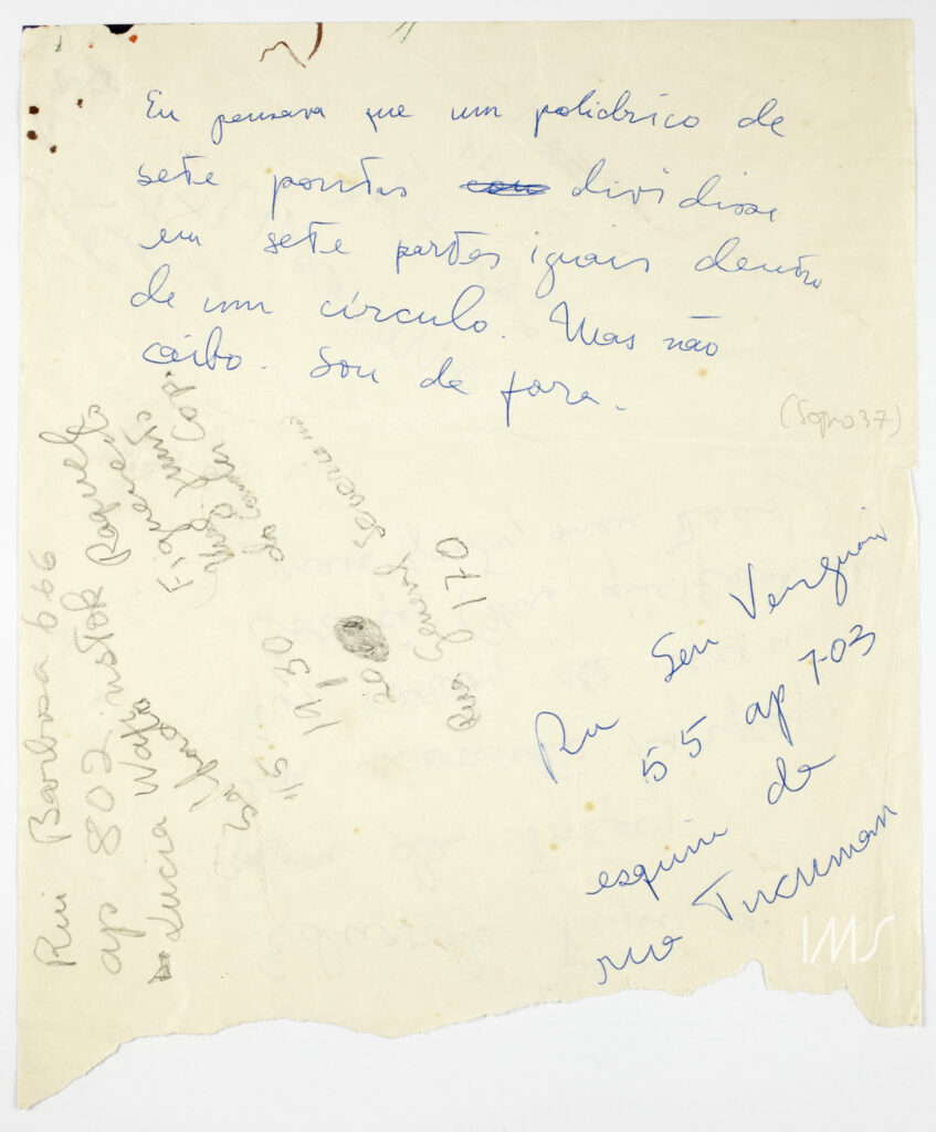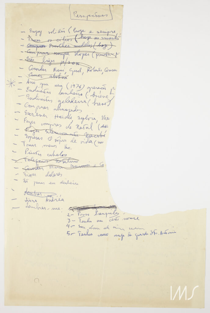 There, instead of numbers, the theme comes in the form of a comment: “Don’t think so much about money.” However, the note that follows almost annuls the previous one because, although she does not want to think so much about money, it is necessary to “Exchange dollars.” Placed side by side, the contradiction has almost a humorous tone, and whoever read it years later did not know what to make of this apparently confusing list of “Perspectives,” arranged on a torn piece of paper. This reader’s doubt, which came after Lispector and before this research, is materialized in the lower left corner with an almost imperceptible question mark in pencil.