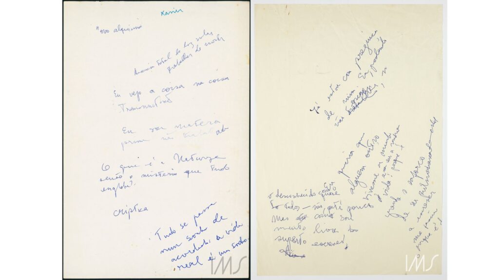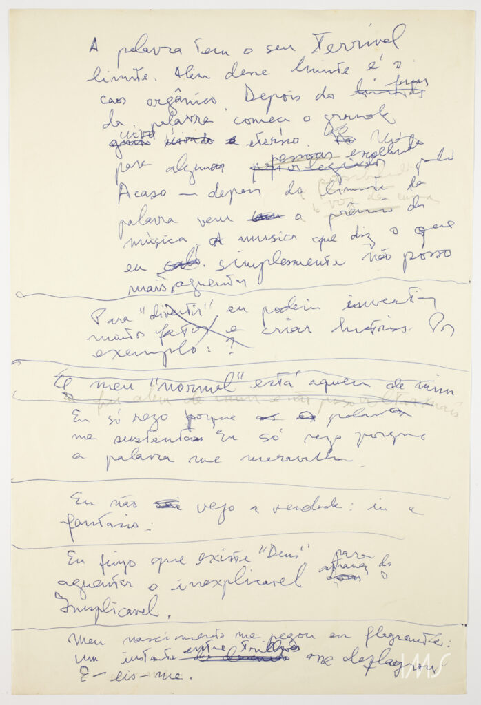 This threat does not seem to be part of Lispector’s repertoire: she is not frightened by the end of space, but invents others, whether by going up, going down, or flanking the base text. If the margins exist as a physical limitation, her text – without any limitation whatsoever – revolves around itself, whose end only finishes with the end of the idea.