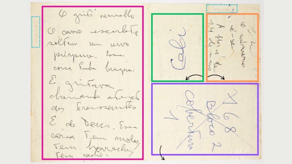 Folio 001501_0296-02 presents four different sections on a page divided in half: on the left side, there is the pink section with the block of text titled “O grito vermelho” [The Red Cry], which according to the pencil inscription on the side – of unidentified authorship – would appear on page 114 of A Breath of Life; the right side contains the 3 remaining sections, which in terms of scale highlight the information in the green and purple blocks, respectively, “Cali” and “168 Bloco 2 cobertura 1” [168 Block 2 Penthouse 1].