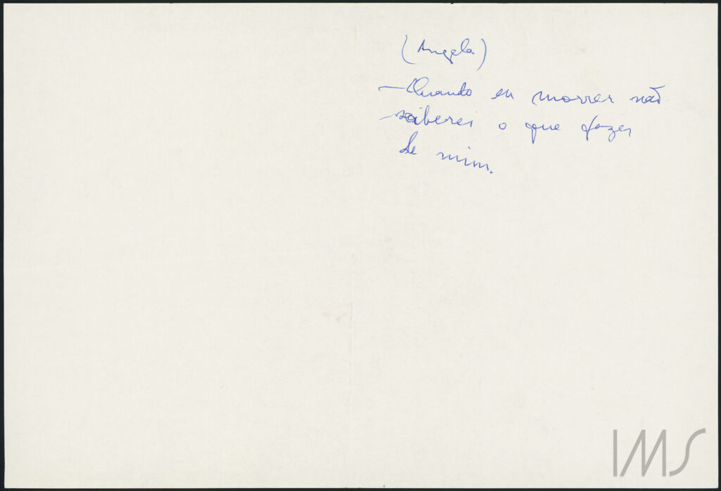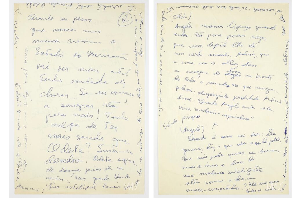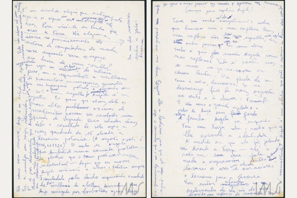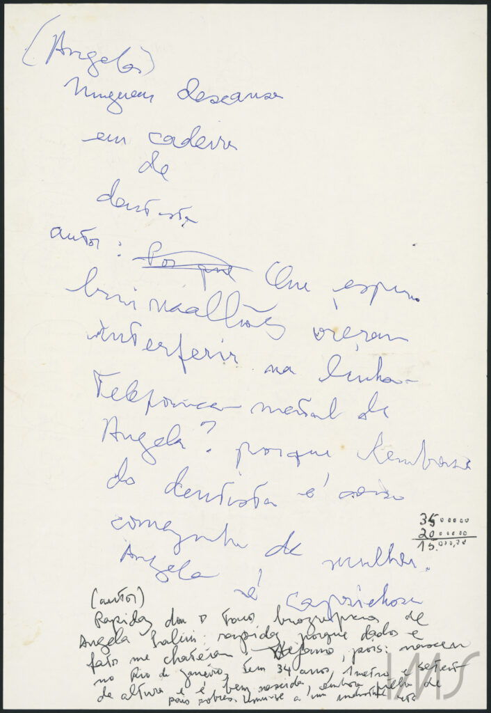 The pen colors – blue and black – also compute at least two periods. In black, by this point, Angela Pralini acquires her first biographical features: “quickly because data and facts bore me. Let us see, then: she was born in Rio de Janeiro, is 34 years old, 1.70 meters tall, and is well-born, although the daughter of poor parents. She married a student, etc.”