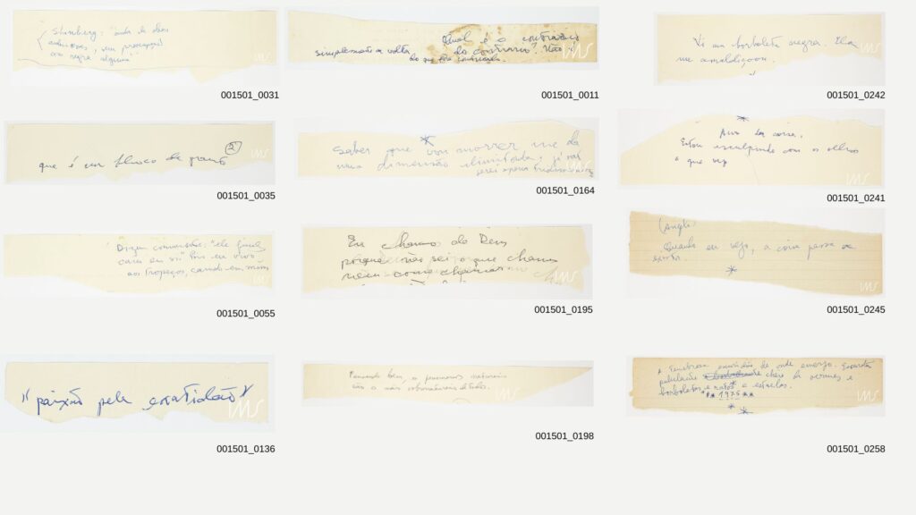 Supported by her words, it is worth embracing what the paper gives: tears become silent witnesses to gestures that wish to deny what has been done, what has been written. “Tear it up in a fit of mild anger,” Lispector will say to Lerner. In her words, the reference to a “little piece” seems to account for the tiny pieces of mutilated paper that are only 3 cm high. In any case, the torn pieces can either become an archive or trash, depending on their fate. If these leaves were kept in the archive, would it have been because Clarice tore them up and still kept them? Or were the discarded manuscripts rescued from the debris by others?